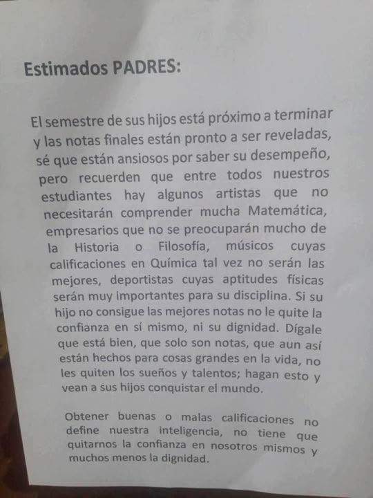 Estes días de fin de curso son moi duros para o noso alumnado (e tamén para o profesorado). De aí que o máis normal é que os docentes nos atopemos con distintos choros e desgustos varios nas clases en relación coas notas finais. Algúns son simples rabietas por un punto máis na nota, pero outros obedecen a unha presión á que, sen querer, sometemos o noso alumnado, ben como pais, ben como docentes. Por iso, é importante que algúns lean esta carta que circula pola rede estes días para reflexionar sobre o asunto.